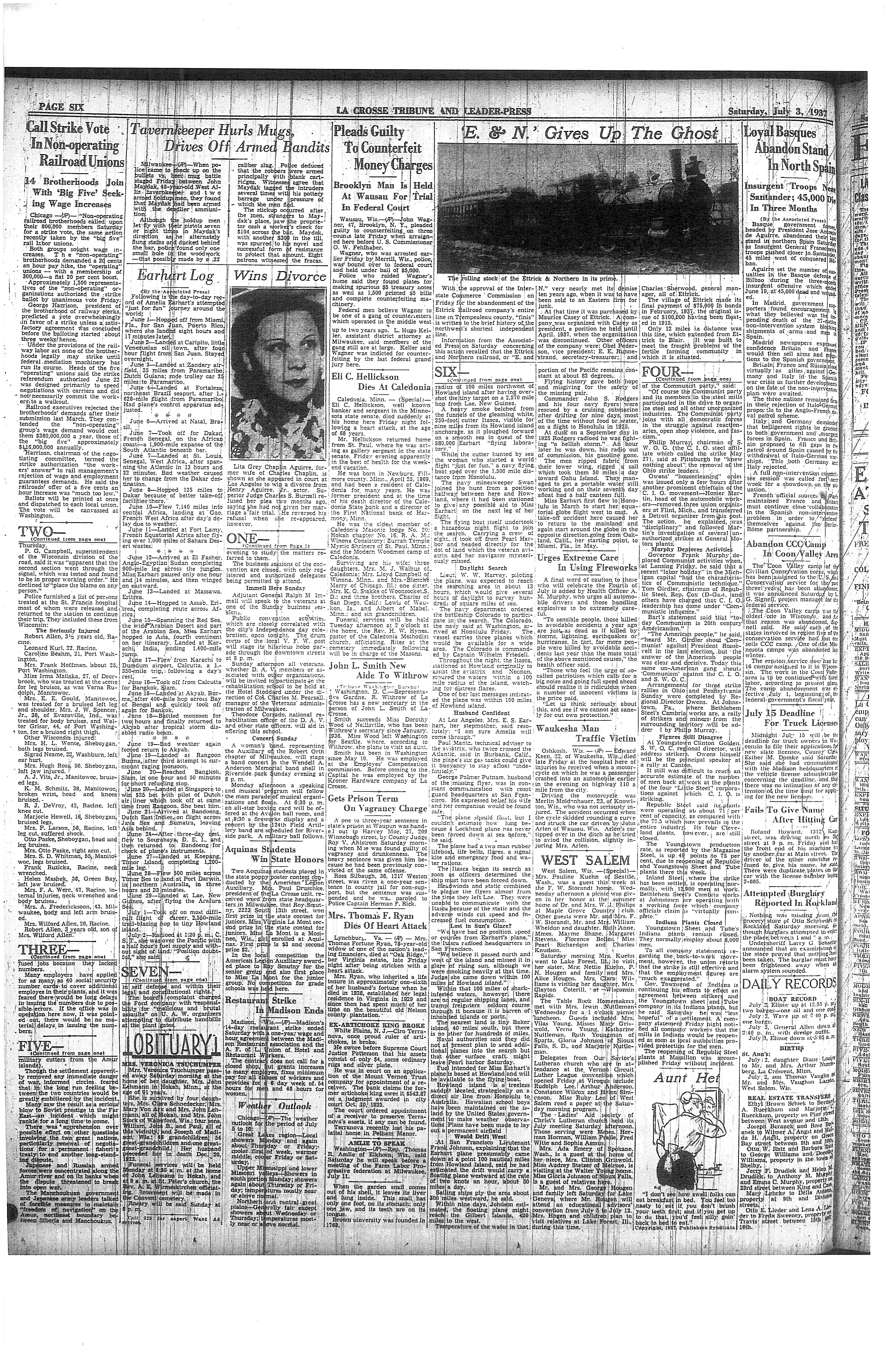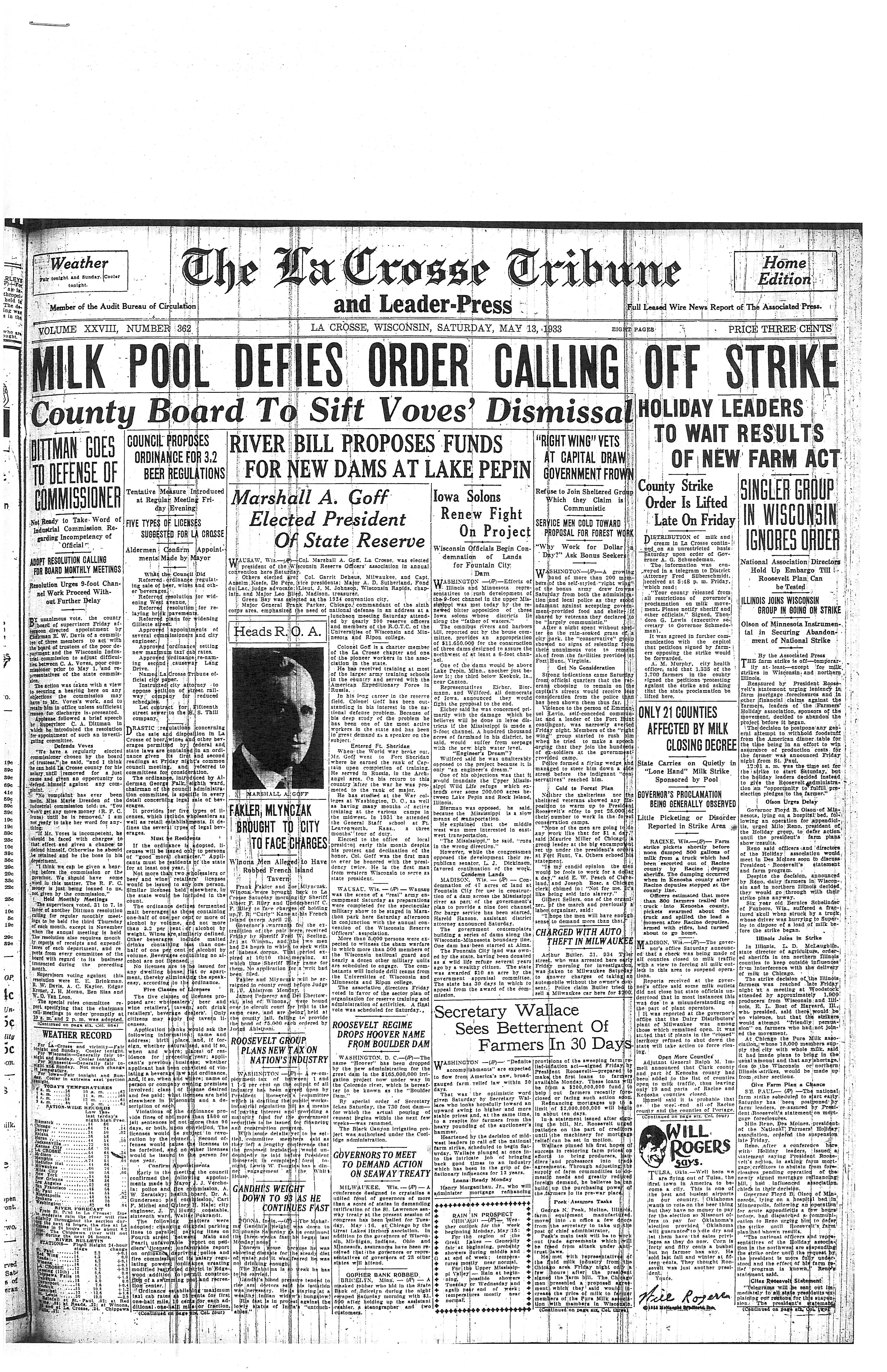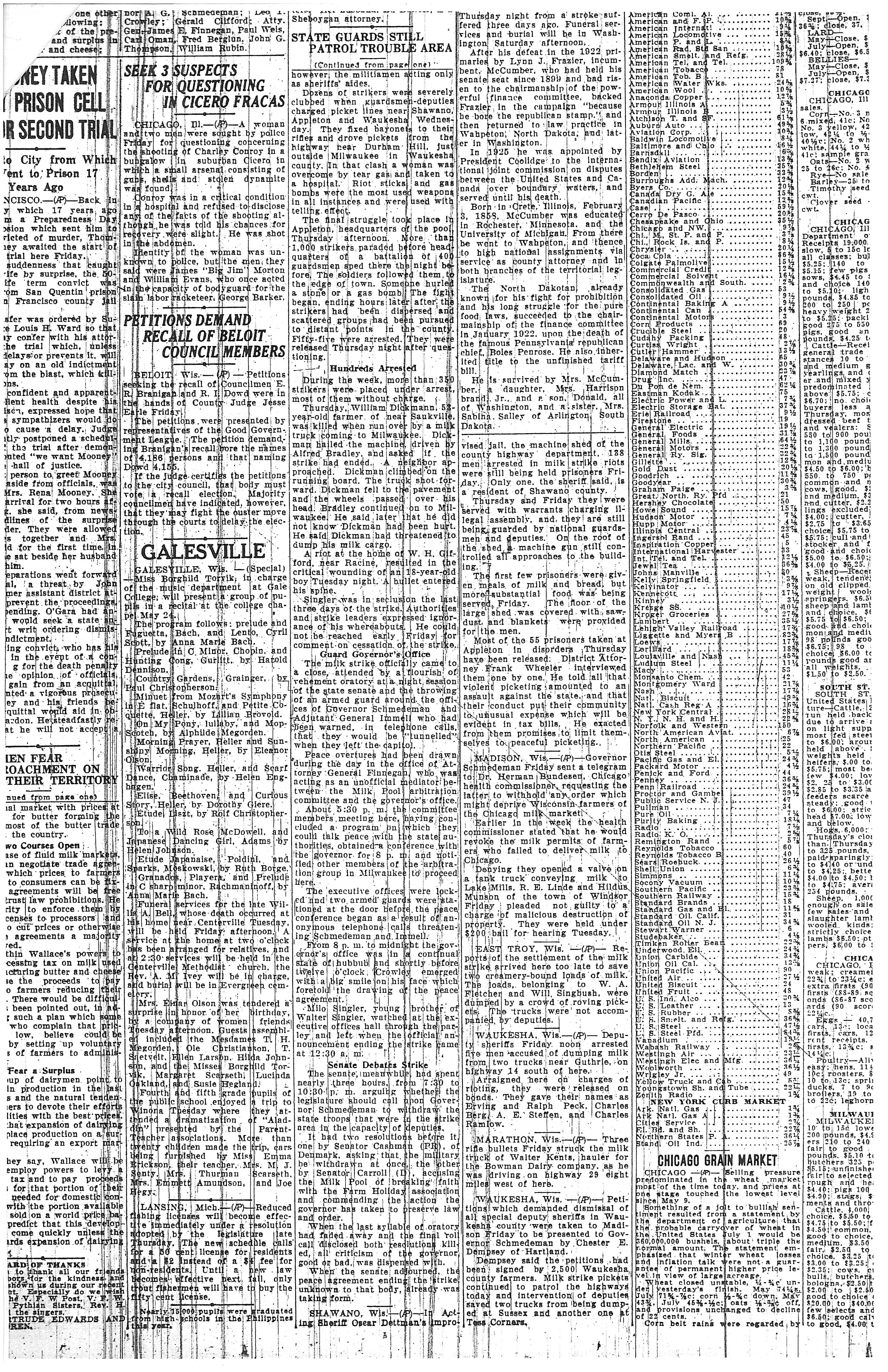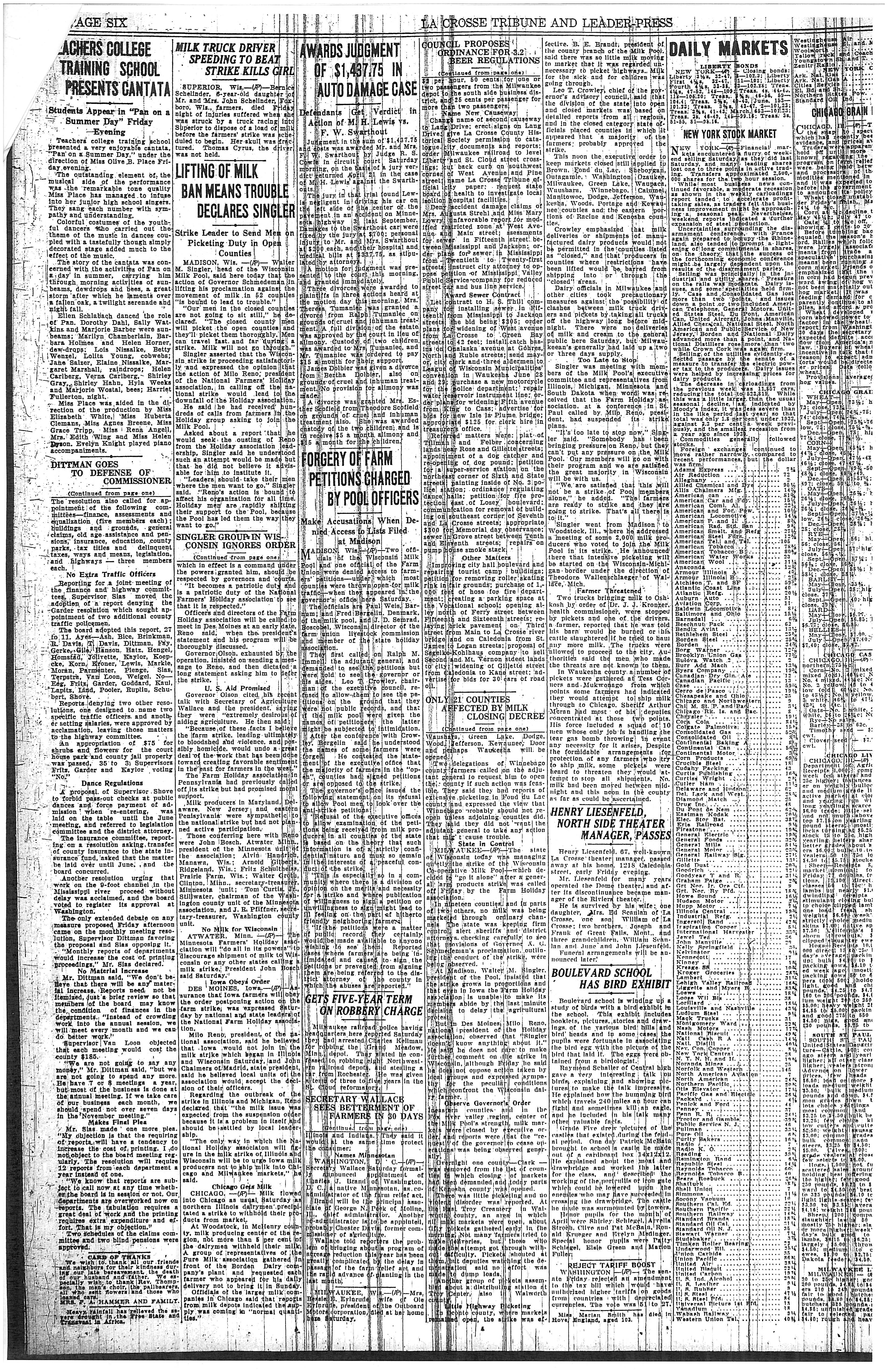 January 9, 1940, page 4 March 31, 1940, page 7 April 7, 1940, page 2April 14, 1940, page 5April 16, 1940, page 11April 17, 1940, page 16November 20, 1940, page 2November 26, 1940, page 14October 13, 1962, page 2October 16, 1962, page 9October 12, 1963, page 3 (insert)October 19, 1963, page 1 (insert)October 25, 1963, page 7March 4, 1972, page 22 September 20, 1984, page 19 October 7, 1984, page 11 February 5, 1987, page 1, part 1 February 5, 1987, page 8, part 2Milk Strike of 1933