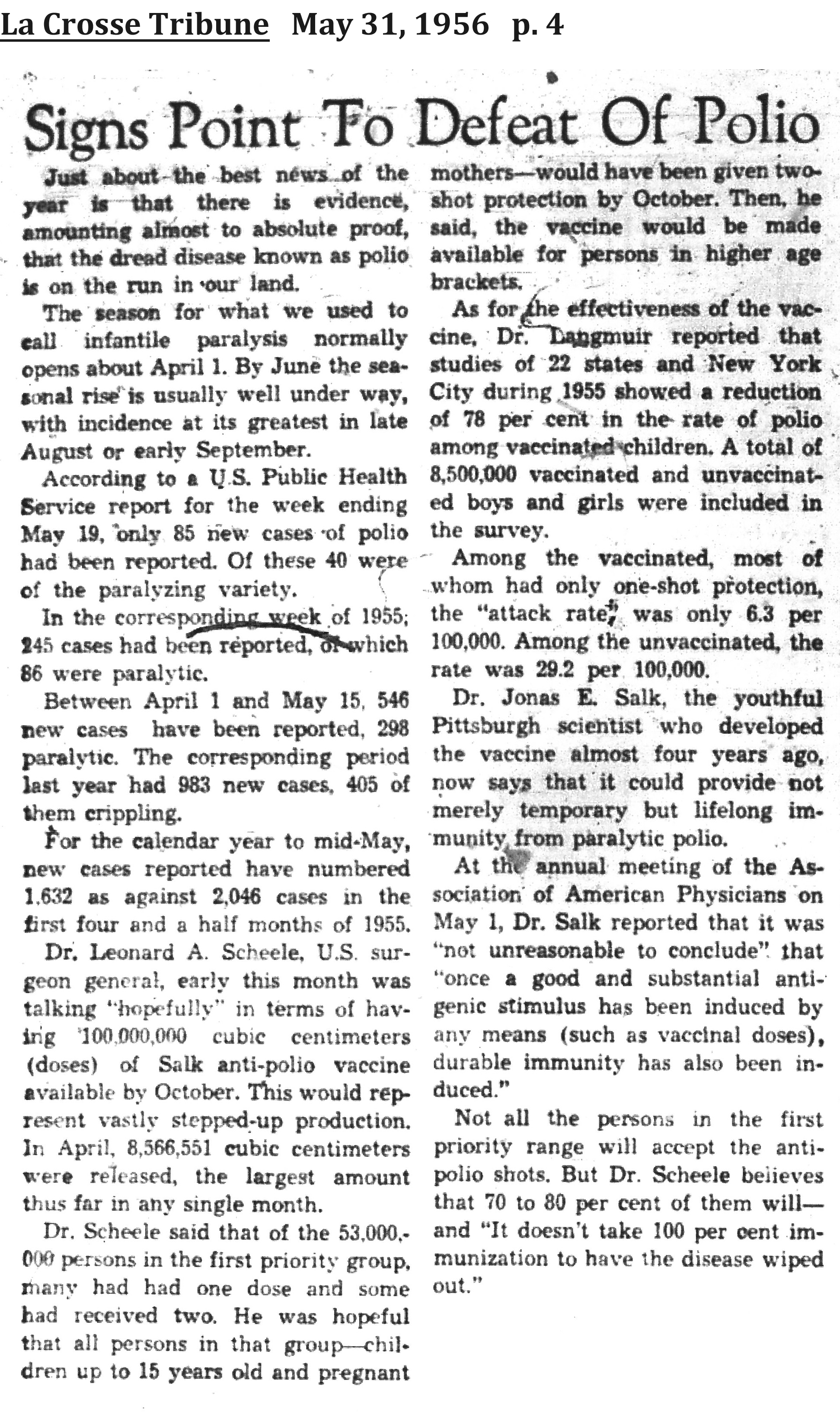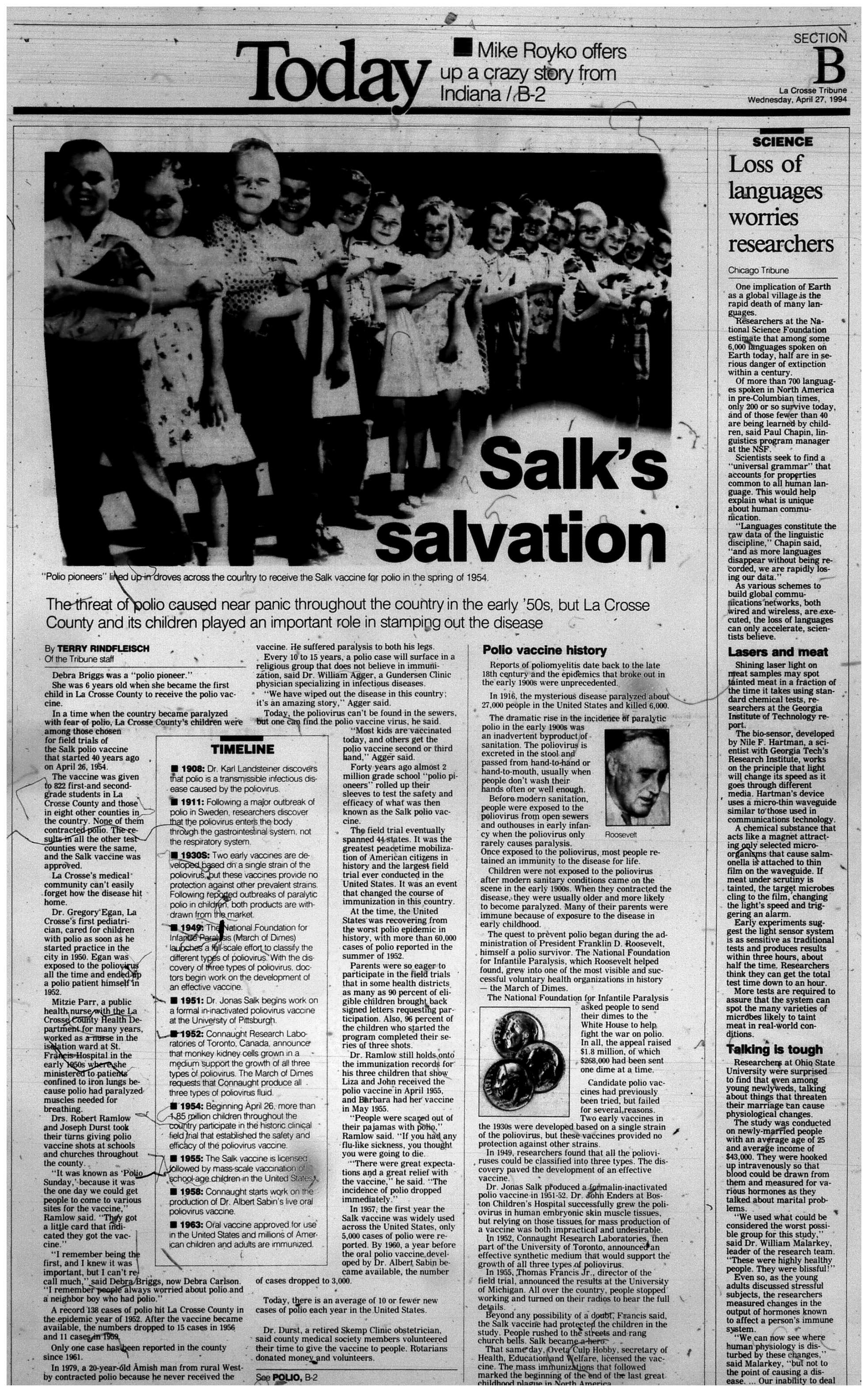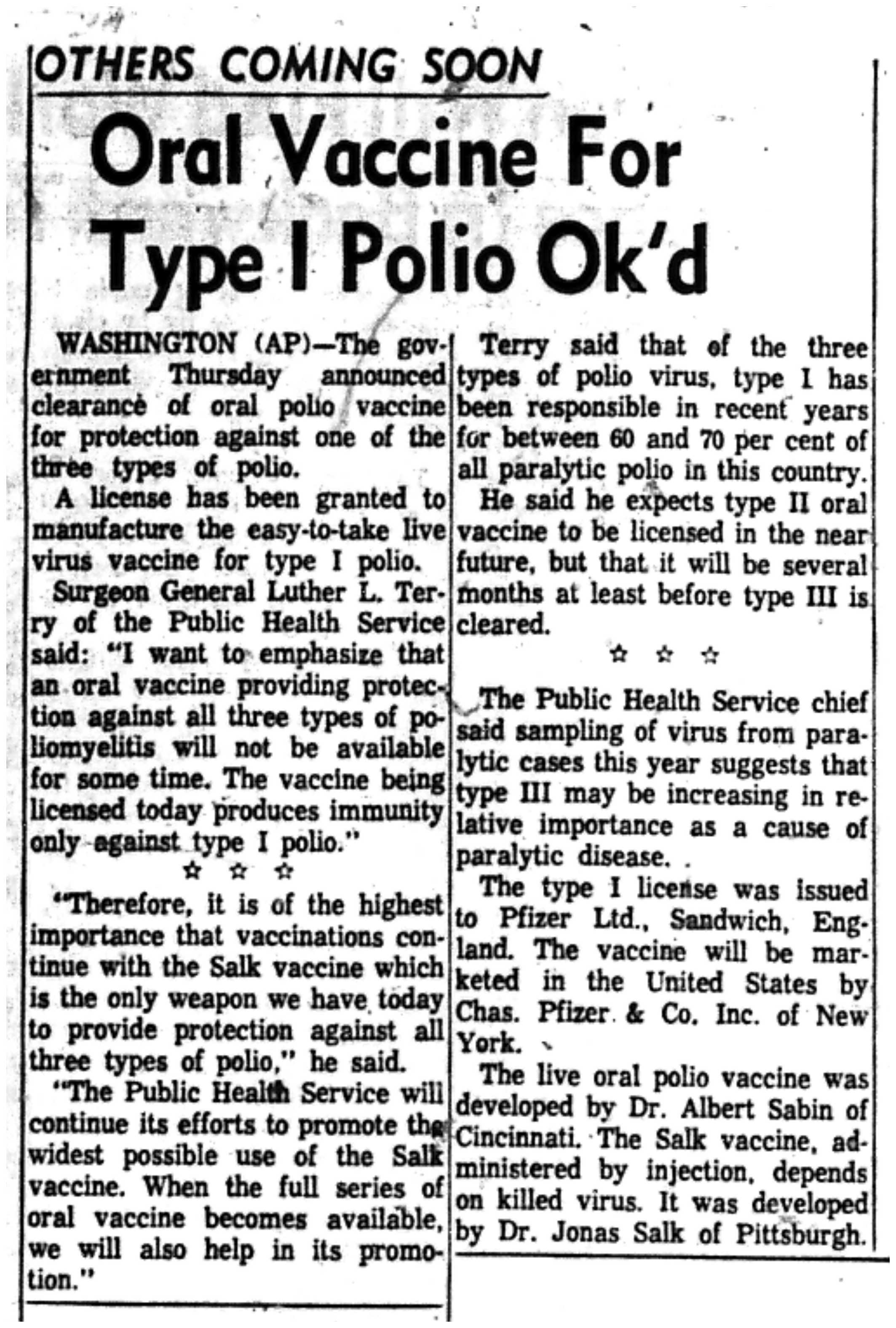 June 12, 1964, page 5 February 11, 1990, page A-1 February 11, 1990, page A-5 April 28, 1994, page A-12 December 6, 2013, page A-1 December 6, 2013, page A-7Polio