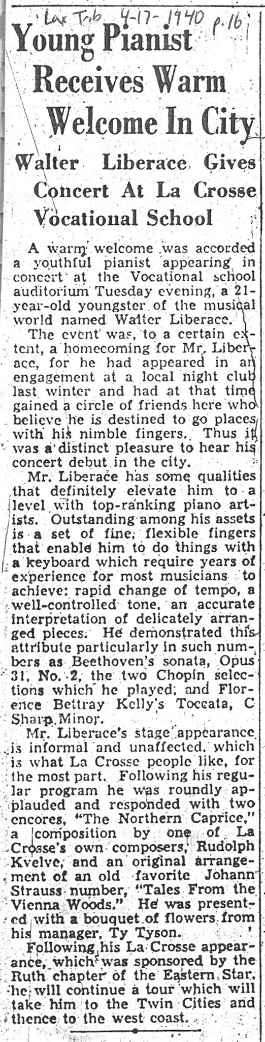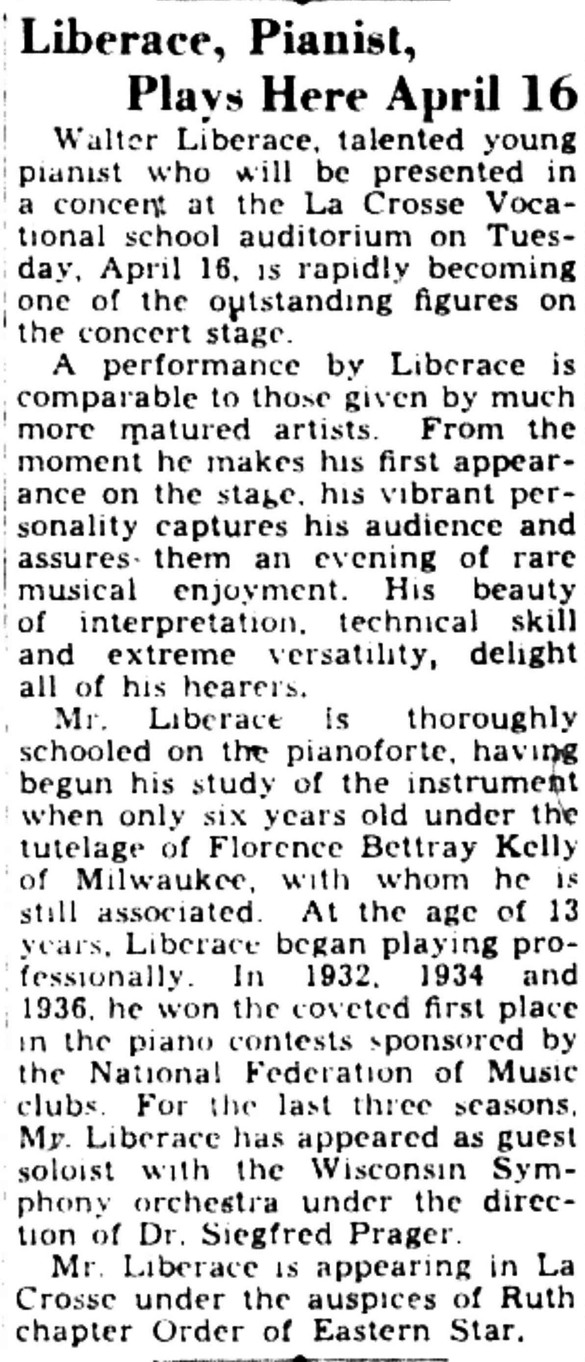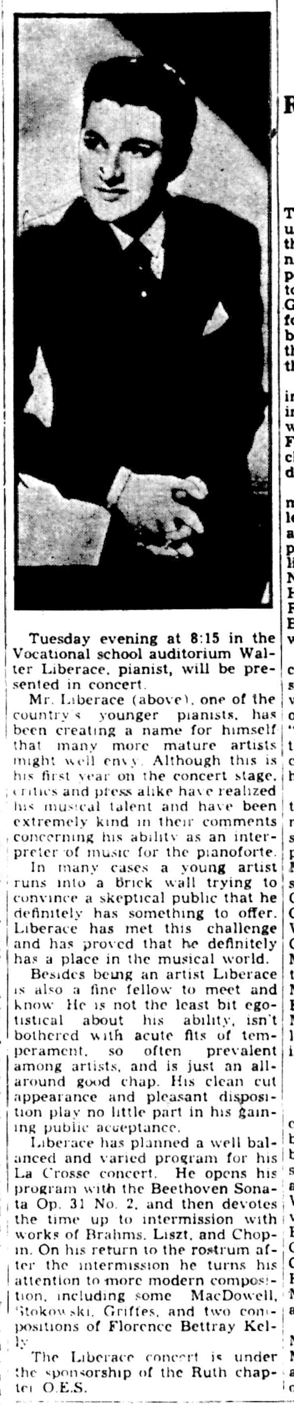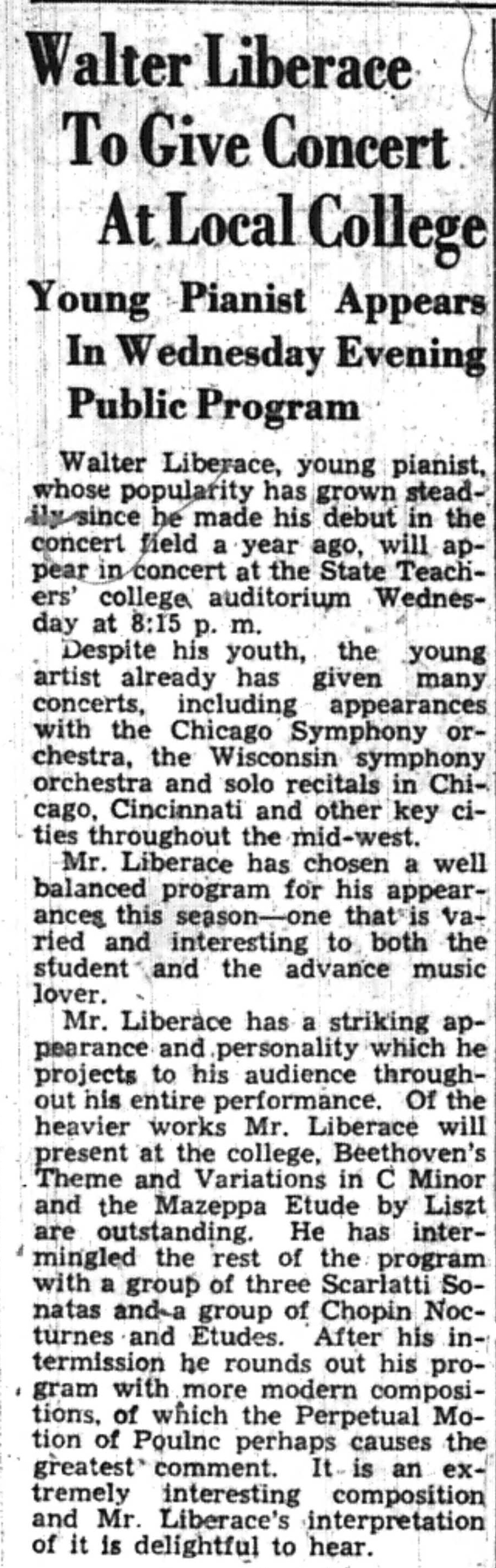 August 3, 1936, page 7 August 4, 1936, page 7 August 5, 1936, page 10 August 9, 1936, page 10 May 3, 1955, page 14 May 4, 1955, page 17Liberace