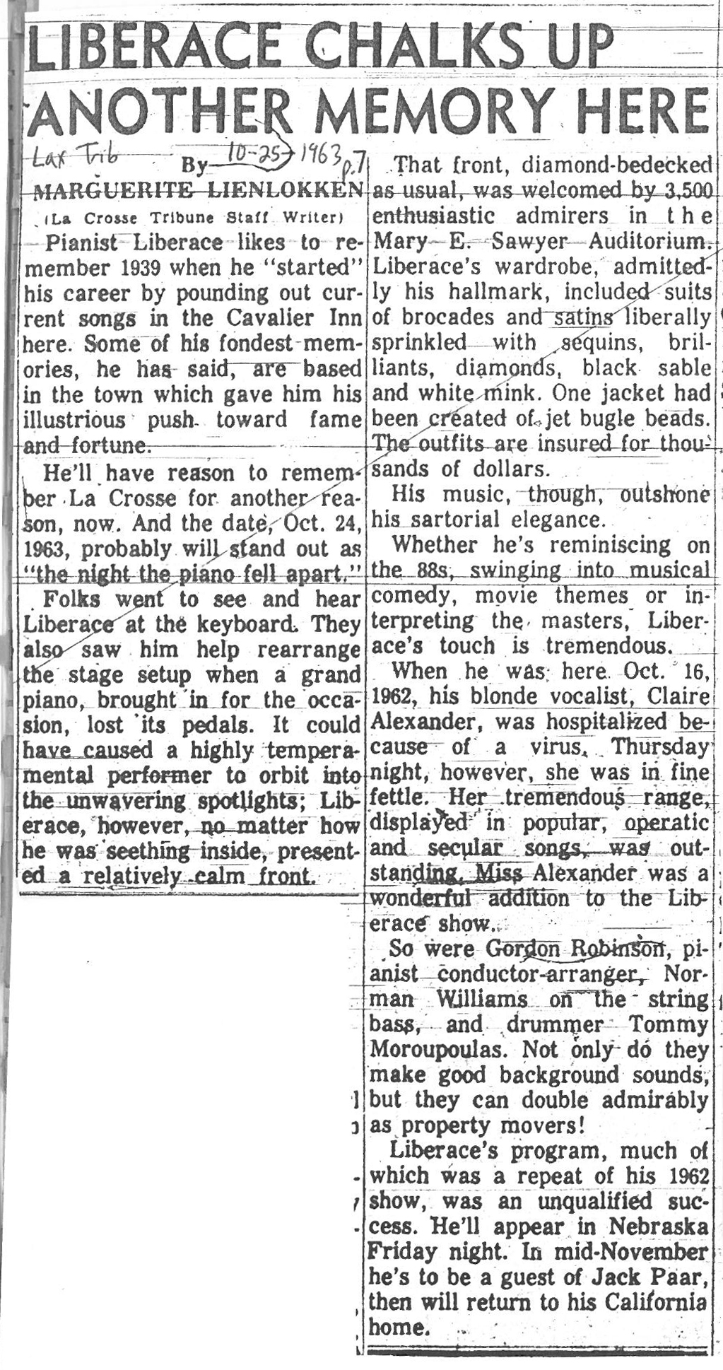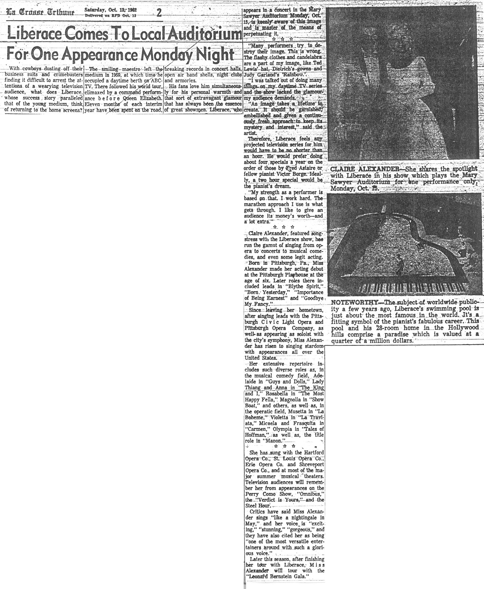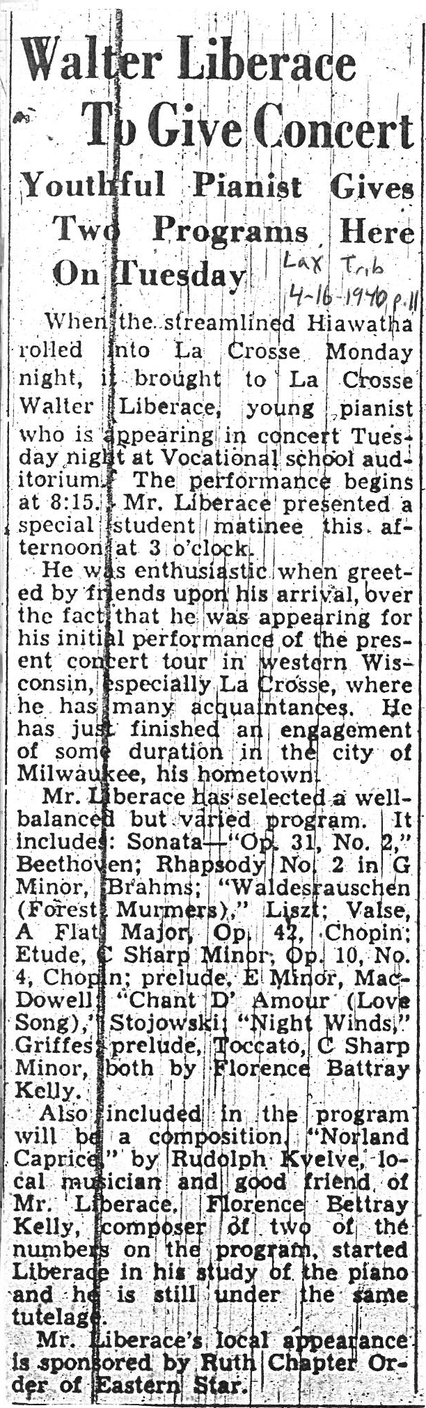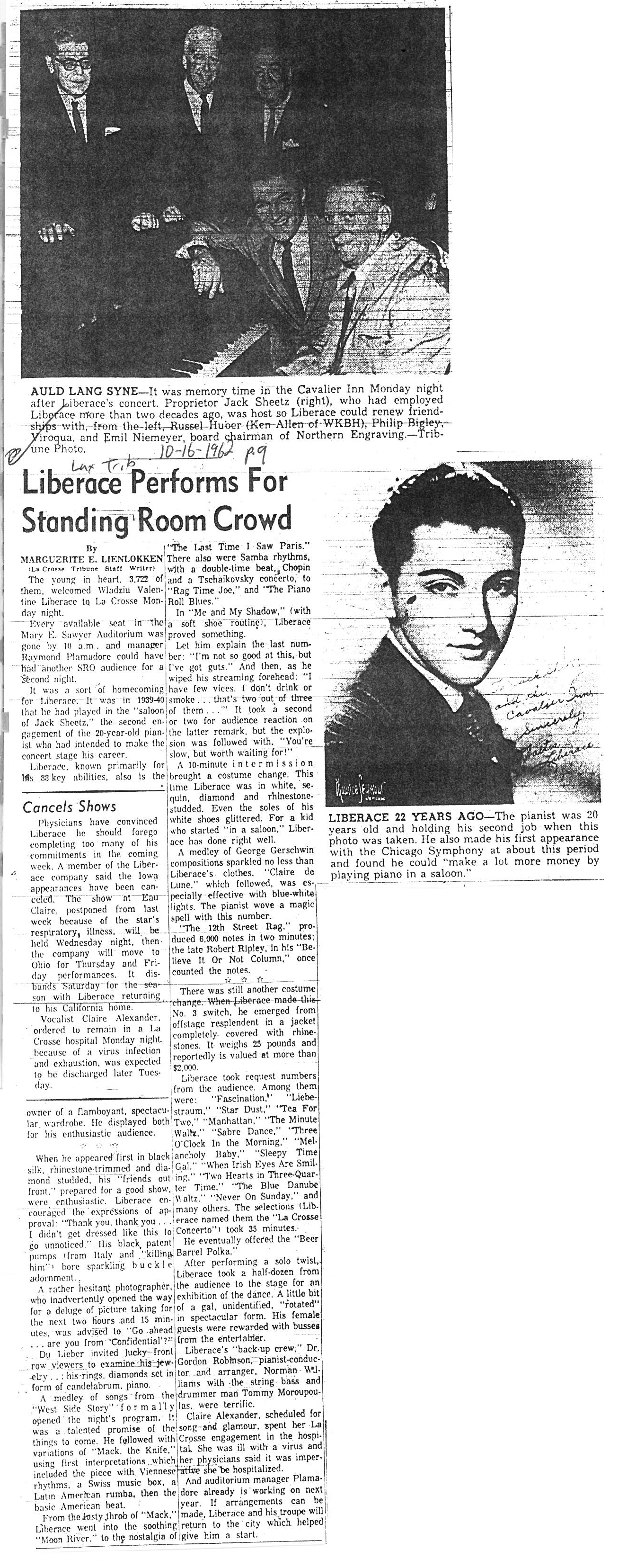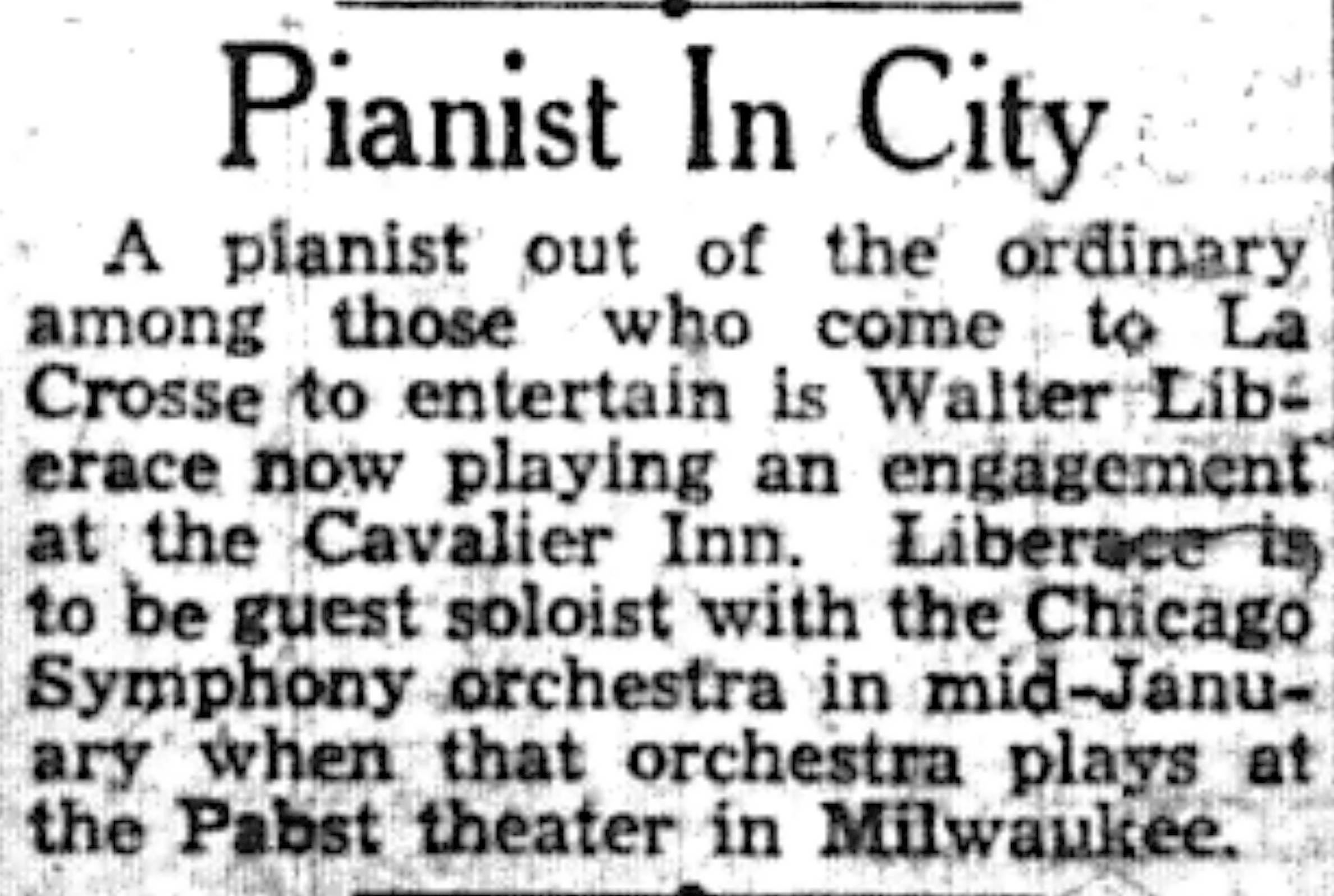 August 3, 1936, page 7 August 4, 1936, page 7 August 5, 1936, page 10 August 9, 1936, page 10 May 3, 1955, page 14 May 4, 1955, page 17Liberace