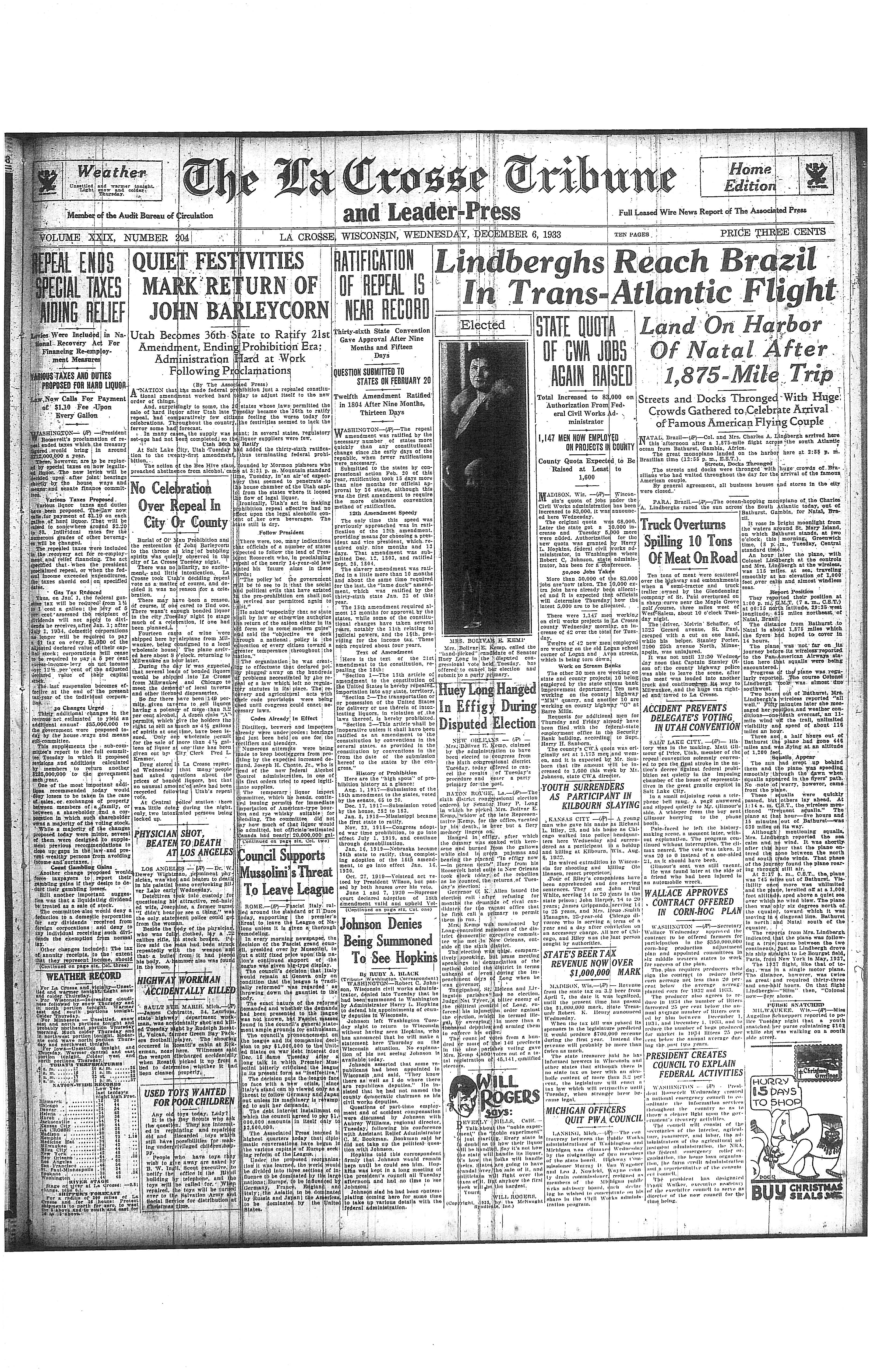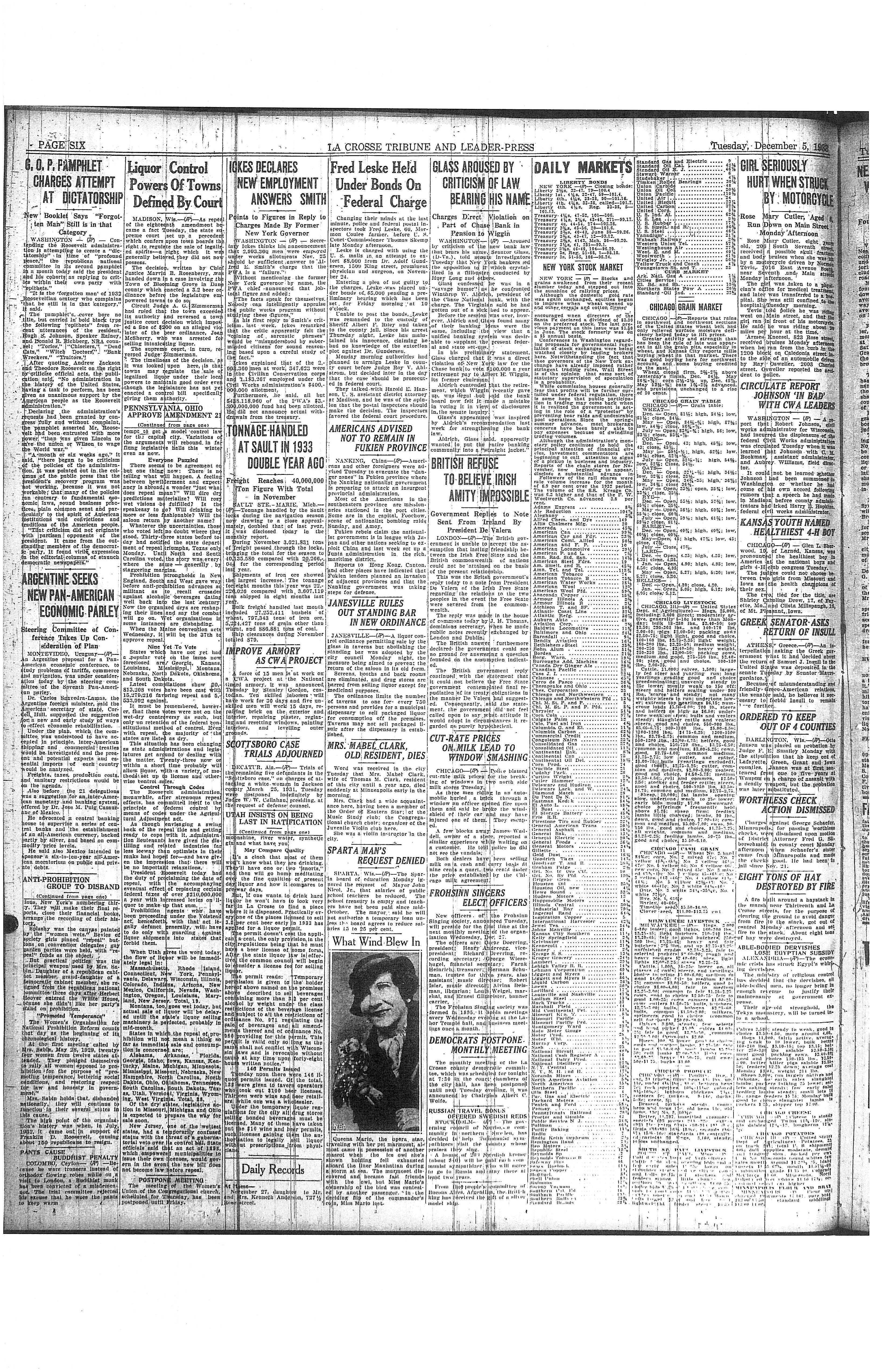 January 16, 1920, page 1 January 16, 1920, page 7 January 17, 1920, page 1 December 8, 1929, page 1 December 5, 1933, page 1 December 5, 1933, page 6 December 6, 1933, page 1 December 6, 1933, page 6Ronald Reagan