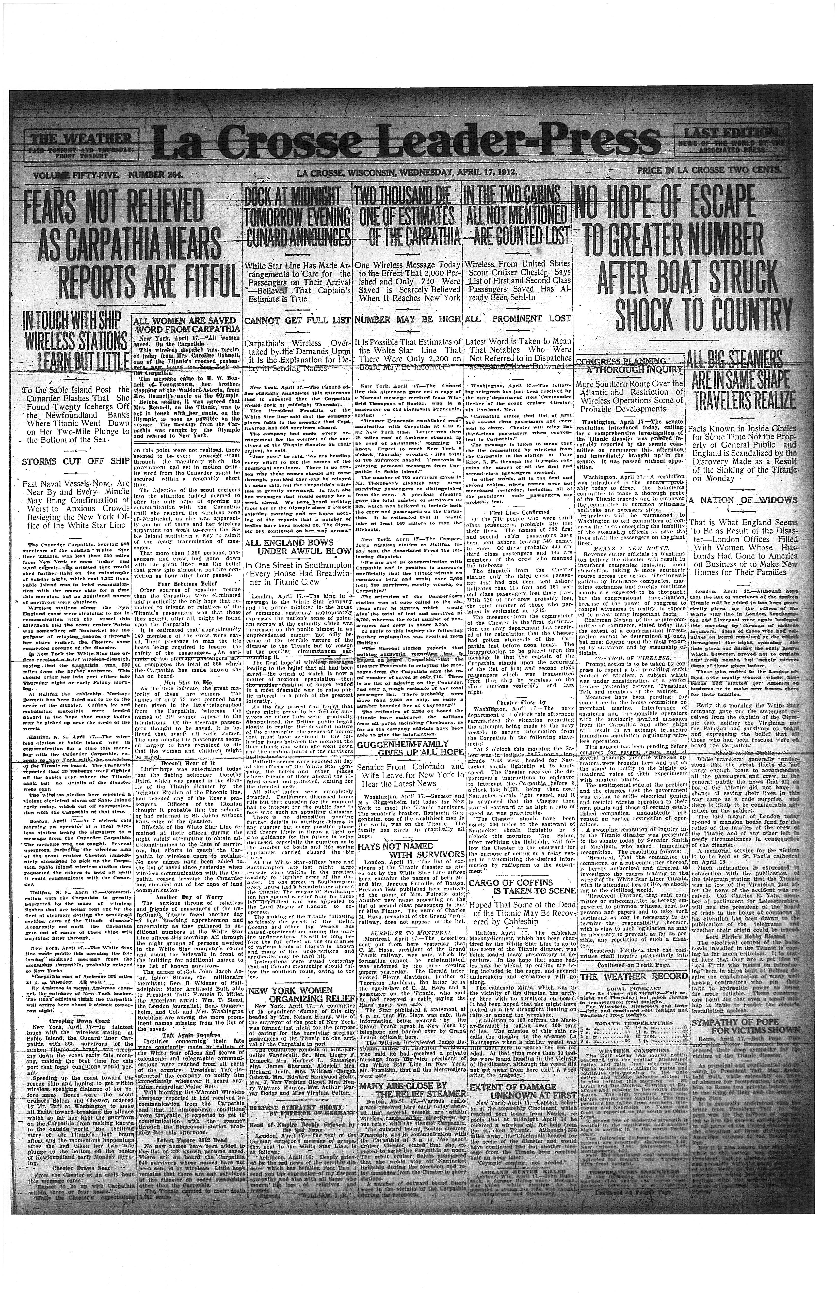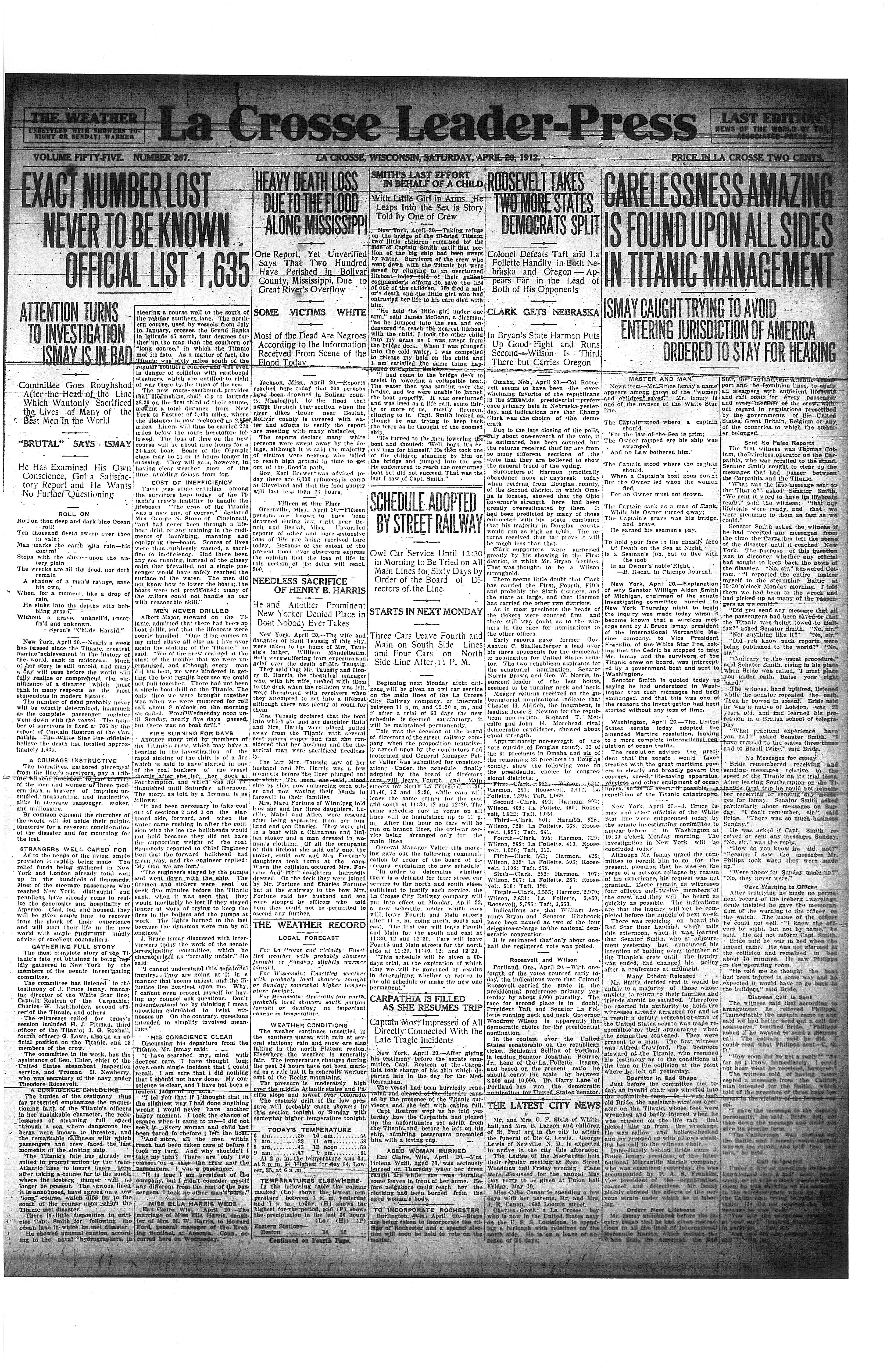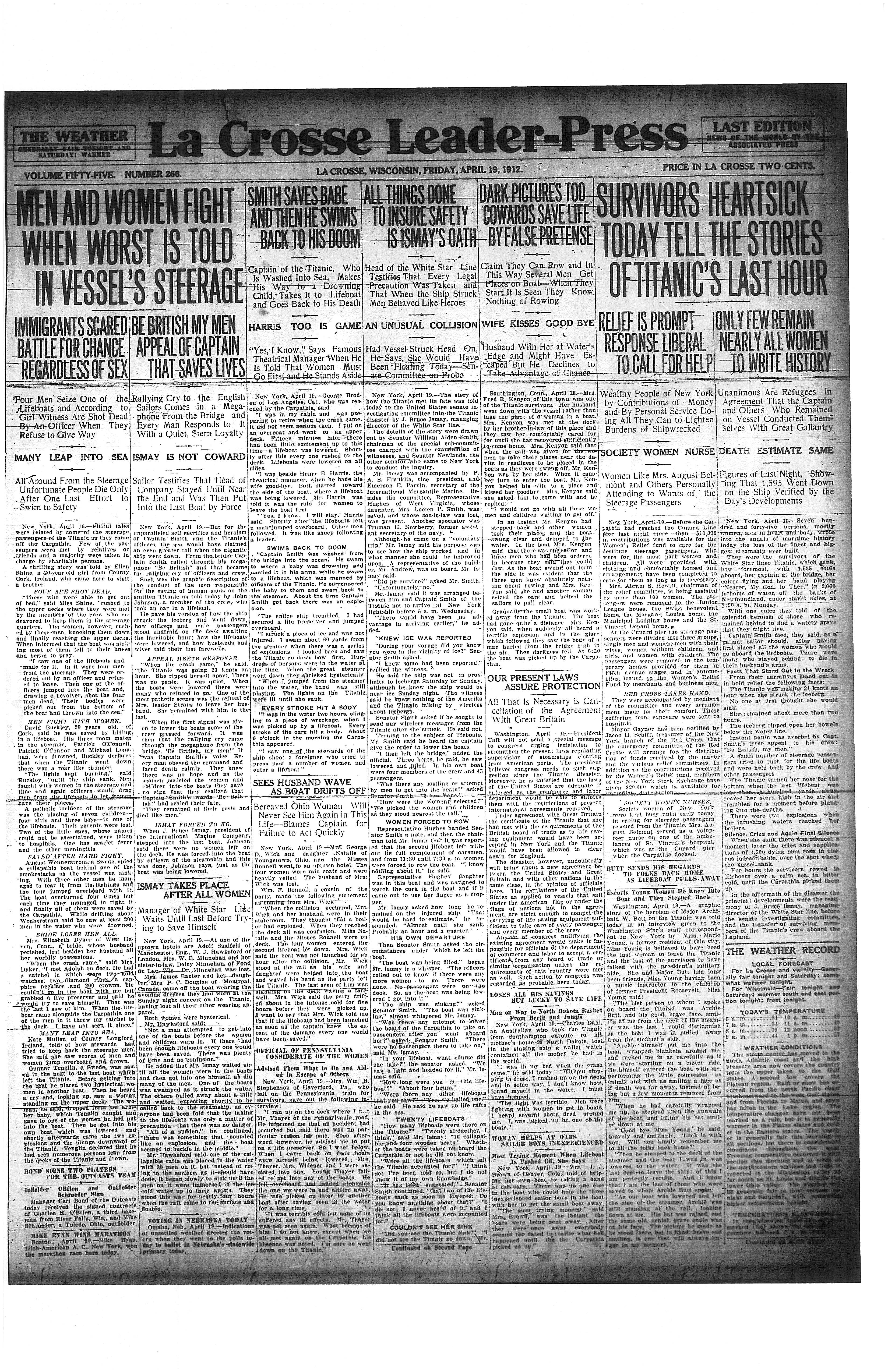 September 15, 1901, page 1 November 9, 1904, page 1 November 9, 1904, page 7 January 6, 1919, page 1 January 6, 1919, page 6Titanic
